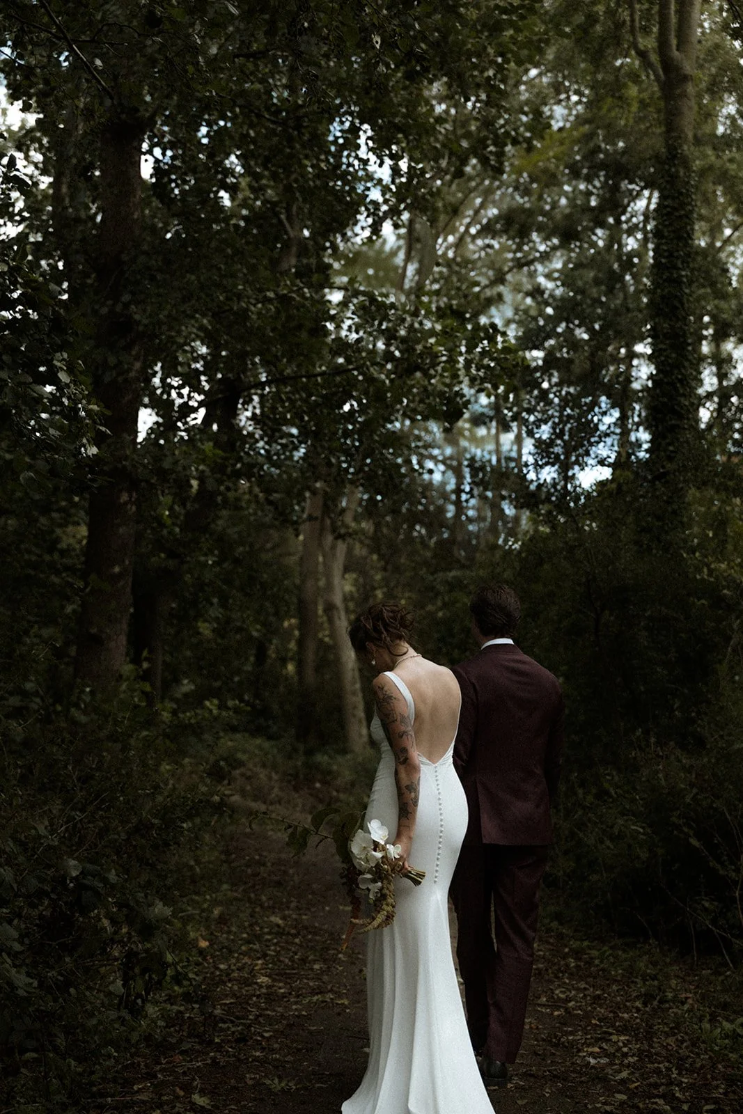 A woman in a shimmering, backless white dress and a man in a light-colored suit walking through a dark, wooded archway decorated with small glowing lights.